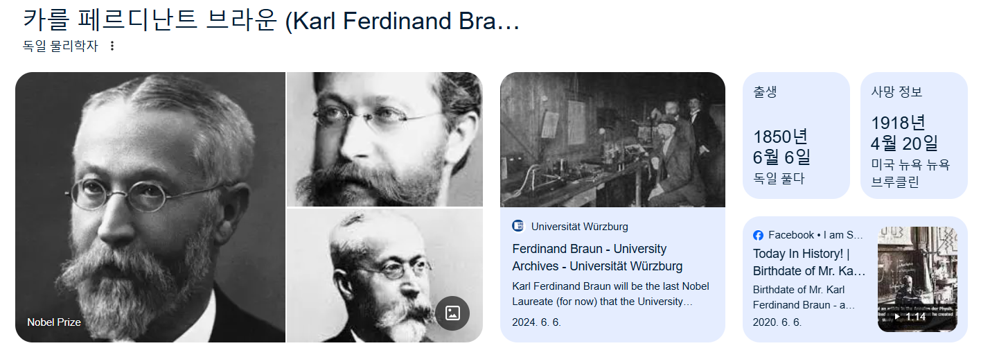 - 1874년 독일의 물리학자 **칼 페르디난드 브라운(Karl Ferdinand Braun)**은 금속과 황화납(PbS) 접촉점에서 전류가 한 방향으로만 흐르는 특성을 발견했습니다. 이는 반도체가 다이오드라는 전자 소자의 기반이 될 수 있음을 시사한 첫 발견이었습니다.